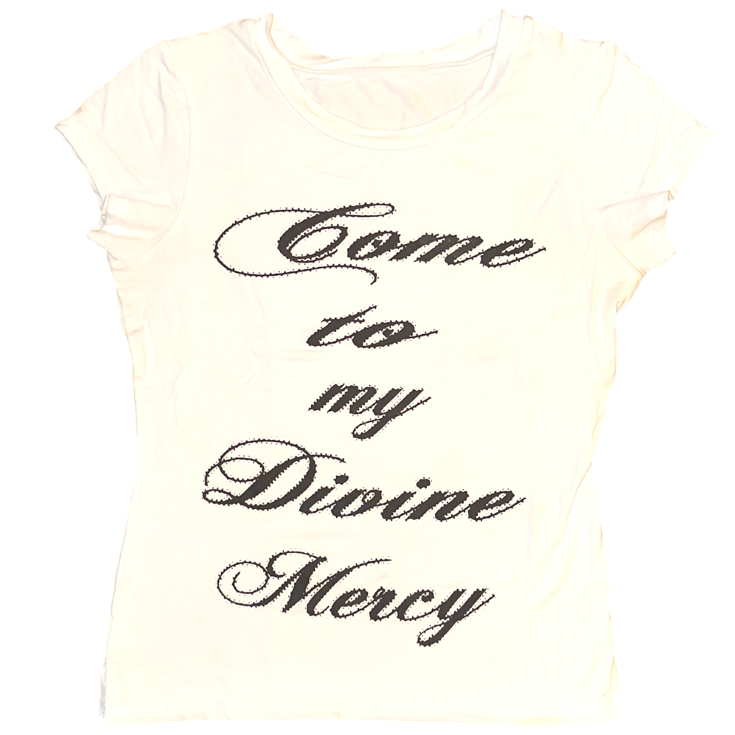 “Come to my Divine Mercy” silkscreened by hand in LA with black ink on our custom cut & sew signature fitted baby tee made with a ultra comfortable 70% cotton/ 30% spandex blend