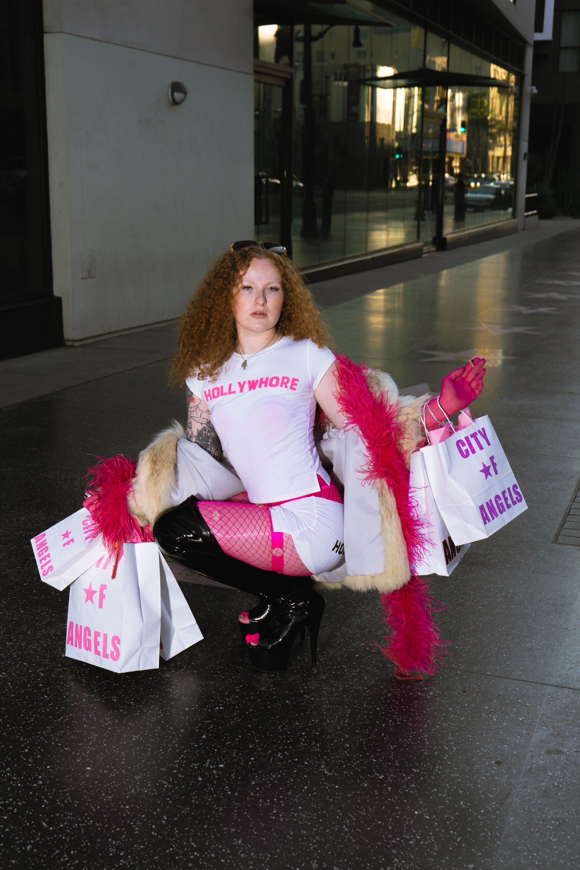 “HOLLYWHORE” silkscreened in hot pink on our custom signature fitted baby tee made with a ultra comfortable 70% cotton/ 30% spandex blend