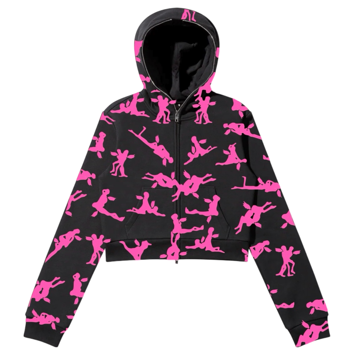 The Positioned Cropped Hoodie features original angel all over print artwork silkscreened by hand as well as a full zip hood. Each piece is unique, please allow slight variation.