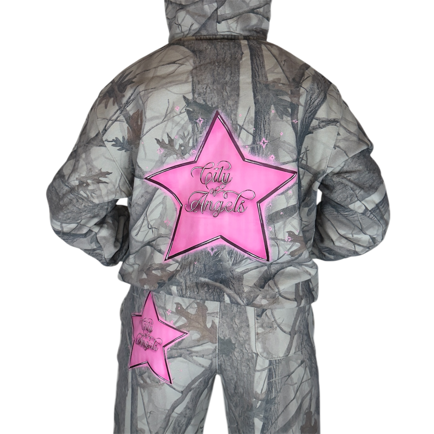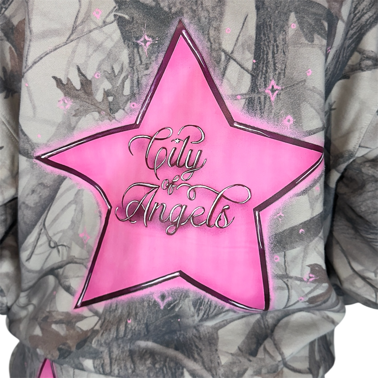The Starred Camo Pullover Hoodie features the “City of Angels” Star artwork on the chest and back. Each piece is unique, please allow slight color variation. Recommended to order full set together to guarantee color match.